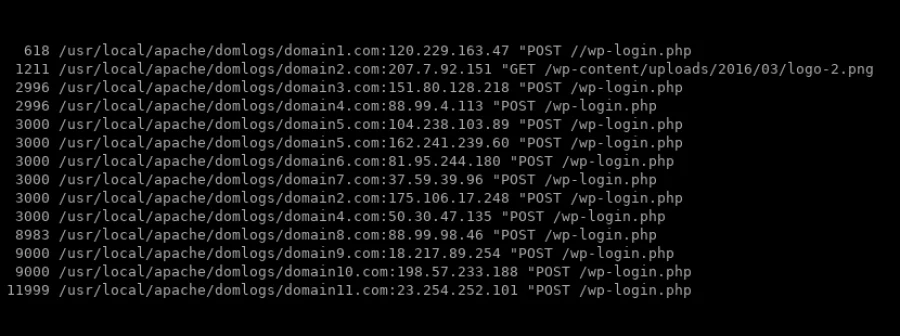 grep -s $date /usr/local/apache/domlogs/* | grep wp-login.php | awk {'print $1,$6,$7'} | sort | uniq -c | sort -n | tail -20