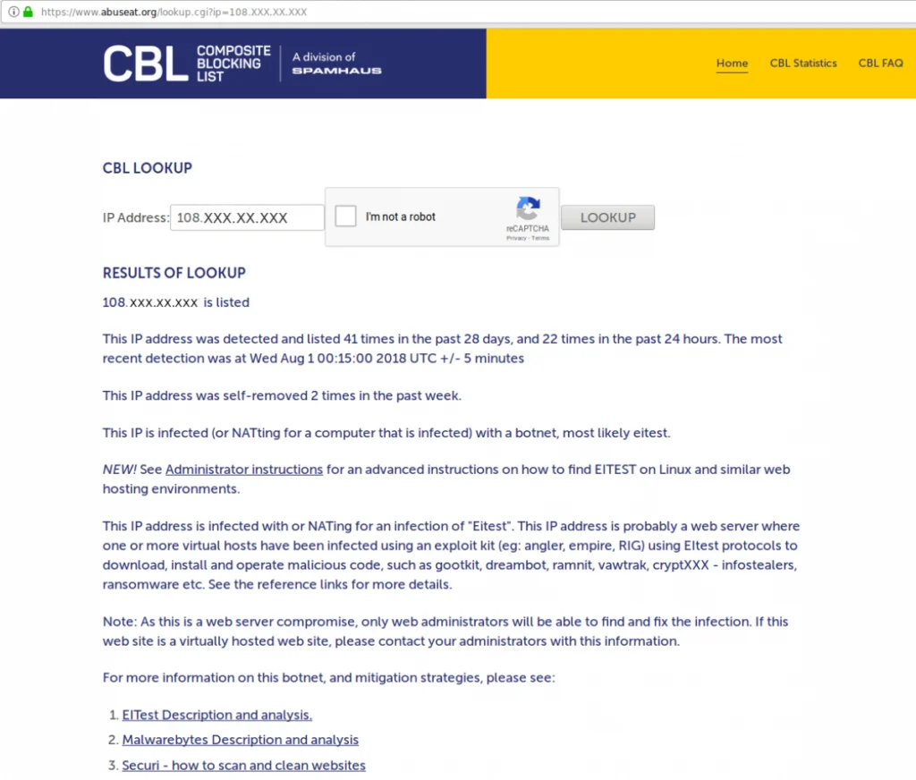 You have probably found this article because your server’s IP is blacklisted via Spamhaus, which then states that the blacklisting is due to being listed on the CBL due to an EITest infection.