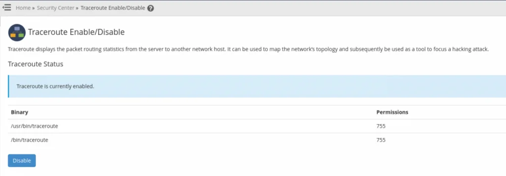 If you are testing from a cPanel server, then you may need to enable traceroute in that server via WHM >> Home >> Security Center >> Traceroute Enable/Disable. The following indicates a server with Traceroute enabled.