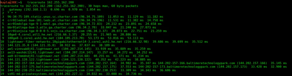 traceroute example.comIf you are testing the Atlanta location, then you will use the following command: