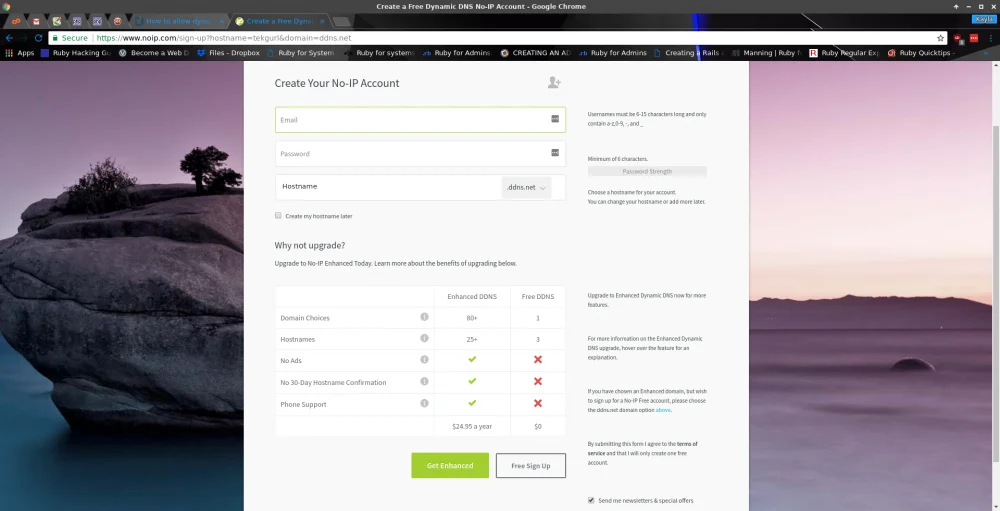 Enter your desired hostname and then click “Sign Up”. You will then need to complete the sign-up process by entering an email account, a password, and confirming the hostname you’d like to use: