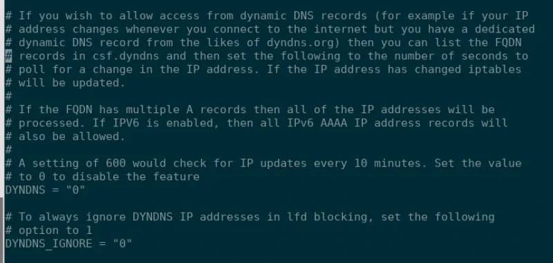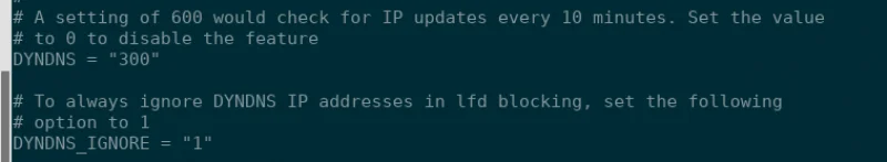 - Open “csf.conf” and set DYNDNS to whatever interval you’d like the check for a new IP to run ( e.g. DYNDNS = “300” would check for IP updates every 5 minutes) and set DYNDNS_IGNORE = “1” to always ignore DYNDNS IP addresses in lfd blocking