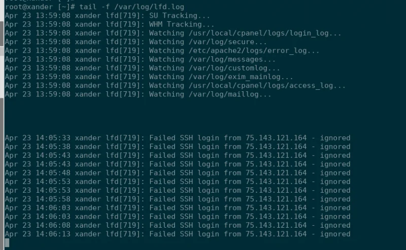 csf -tr XXX.XX.XX.XXXNow you may test to make sure you are whitelisted due to DynDNS and not due to any previous rules added. To test, I repeatedly attempted to log in via SSH as root using the wrong password while tailing the LFD logs. You may tail, or watch, the LFD logs via SSH with the following command: