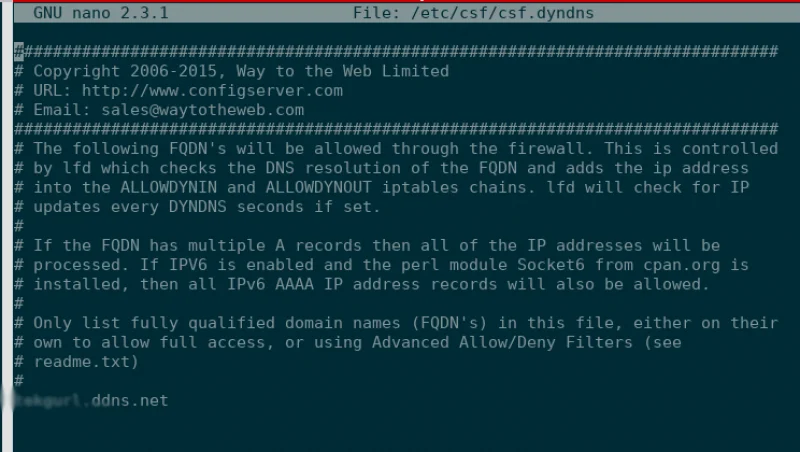 - Open “csf.dyndns” and add the hostname of your no-ip account.