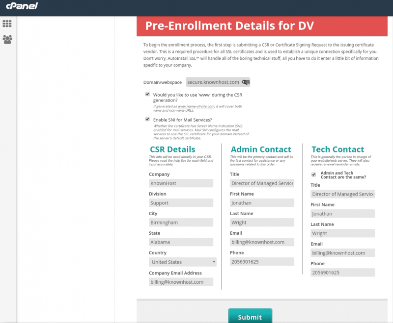 Before you can install your SSL certificate after purchase you need to generate a Certificate Signing Request (CSR) and send it to your SSL vendor. If you purchased your SSL from KnownHost the CSR can be entered at my KnownHost panel. If you purchased your SSL certificate somewhere else you’ll enter it on the website where you purchased the certificate.