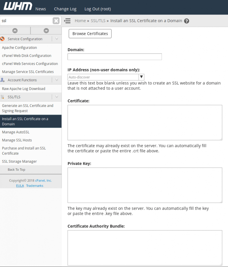 SSL certificates can also be installed as the from within WHM as well, though the interface can be somewhat less intuitive than installing via a cPanel account (but it is faster if you already have the certificate, private key, and CA bundle extracted and ready for installation – or if you’re just more comfortable with WHM.)