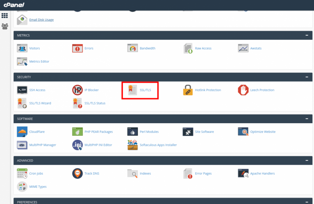 This guide assumes that you have already generated the Certificate Signing Request (CSR) and the private key is already stored on the server. If the private key has not been added, you can do so in a below step. In cPanel, click on the icon labeled SSL/TLS.