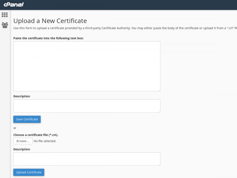 If your certificate was provided in the .crt file format (you may need to extract this file from a zip archive) you can choose the Browse… button to select the file from your computer (or other device) and upload it to the server without having to copy and paste the information directly. Once you have selected the file (and entered an optional description) click on the Upload Certificate – if the certificate is in the right format, cPanel will automatically save the certificate for you.