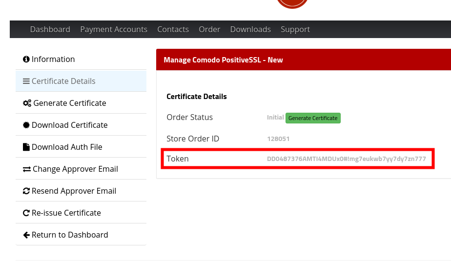 The token is emailed to you when you purchase the SSL certificate. Within the email you’ll find a snippet similar to the following: