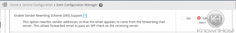Another issue with mail forwarding is the possibility of erroneous SPF failures due to the fact that the intermediate forwarding server is not included in the SPF record but the recipient server sees these messages as coming from the forwarding server. The SPF if set will likely only specify the true source server and not the forwarding server, thus potentially causing SPF failures. To circumvent these SPF failures for forwarded emails, make sure that the following is enabled in your Exim configuration on your cPanel server via WHM » Home » Service Configuration » Exim Configuration Manager under the “Mail” tab: