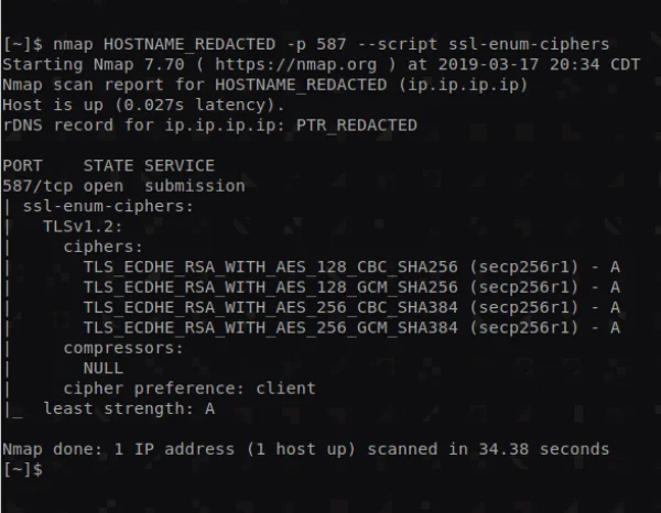 nmap HOSTNAME -p 587 --script ssl-enum-ciphersSMTP via TLS/StartTLS uses port 587 while SMTP via SSL uses port 465. You may also want to test other mail server ports such as IMAP via SSL uses port 993 and POP3 via SSL uses port 995.