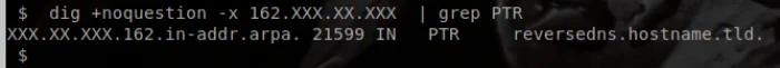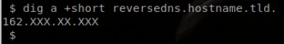 dig a +short hostnameFor example, in the following, we have the IP “162.XXX.XX.XXX”. We check the PTR record for this IP, which returns “reversedns.hostname.tld.”.