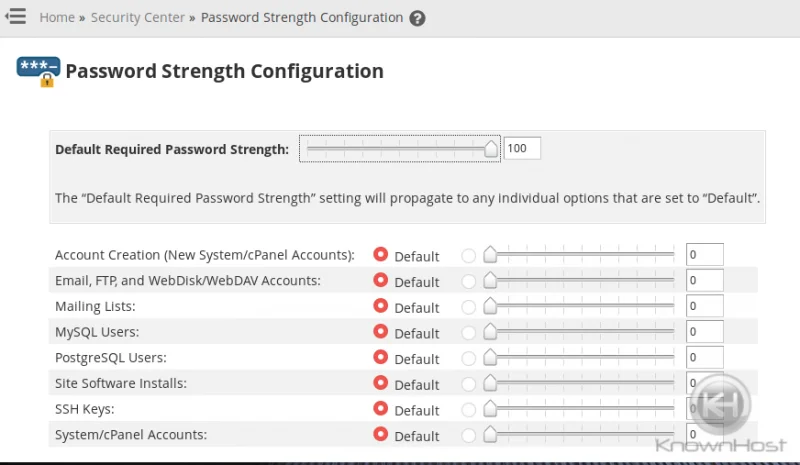This feature allows you to define minimum strengths for passwords for all of cPanel & WHM’s features that require password authentication. The system rates password strength on a scale of 0 to 100, where 100 represents a very strong password.