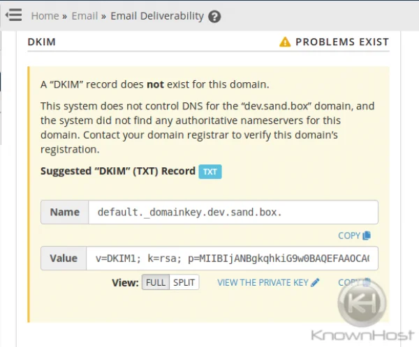 Also, make sure to add SPF and DKIM, for the server’s hostname. Be sure that the PTR exists as well (KnownHost will set this up by default using the hostname as the PTR for the primary IP). This will help tremendously with those ‘sale@site_46fda40b-4dd1-44eb-935a-50f9247e12e9’ emails that are sent from the server to any remote mail server. This can be done via WHM »Email »Email Deliverability for cPanel v78 and up.
