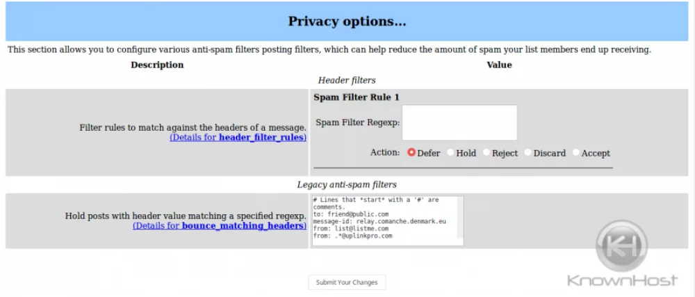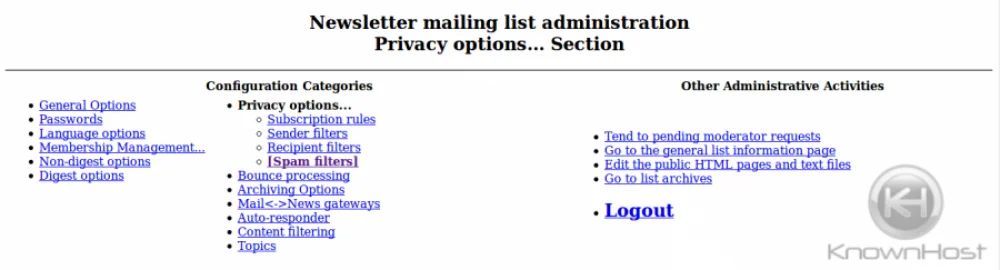 It would be wise to also configure a spam filter for your mailing list. If your account containing the mailing list were to become compromised, having SpamAssassin filter outgoing mailing list emails would be wise to try to limit spam sent as much as possible, especially considering how much effort it takes to properly configure ad maintain a mailing list with a good IP reputation. This can be done via cPanel » Home » Email » Mailing Lists.