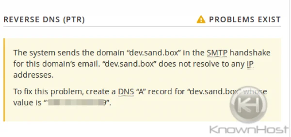 Your mail server IP absolutely must have a PTR record if you will be sending mail, otherwise your emails will likely be rejected. KnownHost sets a PTR record for your primary IP to use your hostname. If you decide to change your hostname, please notify KnownHost immediately so that we may make the appropriate changes on our end. Note that your hostname must also resolve back to the same IP that is using the hostname for its PTR record. If this is not the case, then PTR validation checks may fail. KnownHost does this automatically for the hostname and primary IP as the hostname should resolve to the primary IP and the primary IP will be used by default for sending all mail.