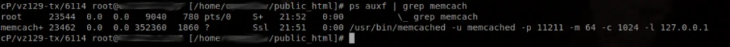 First, check to see if your memcached is vulnerable. You can do by checking to see if the configurations either closes UDP or binds to localhost. Below, we first see an insecure instance of Memcached: